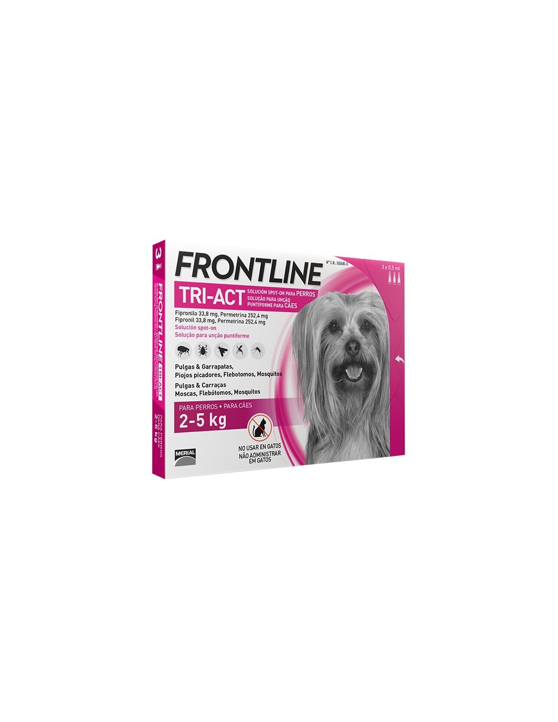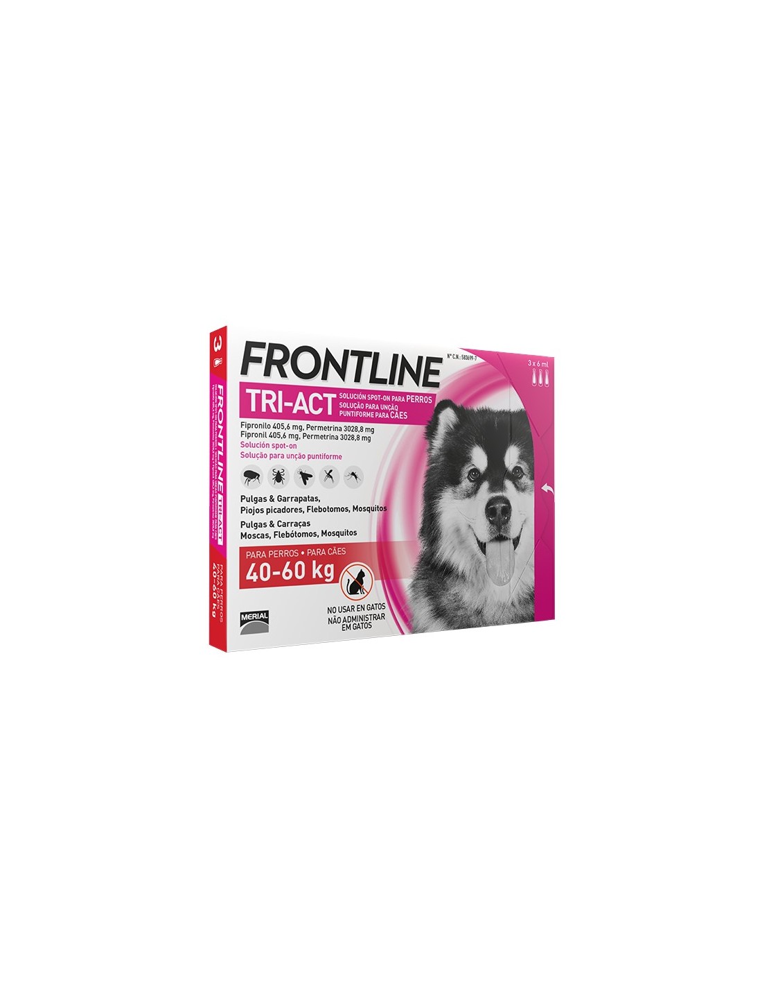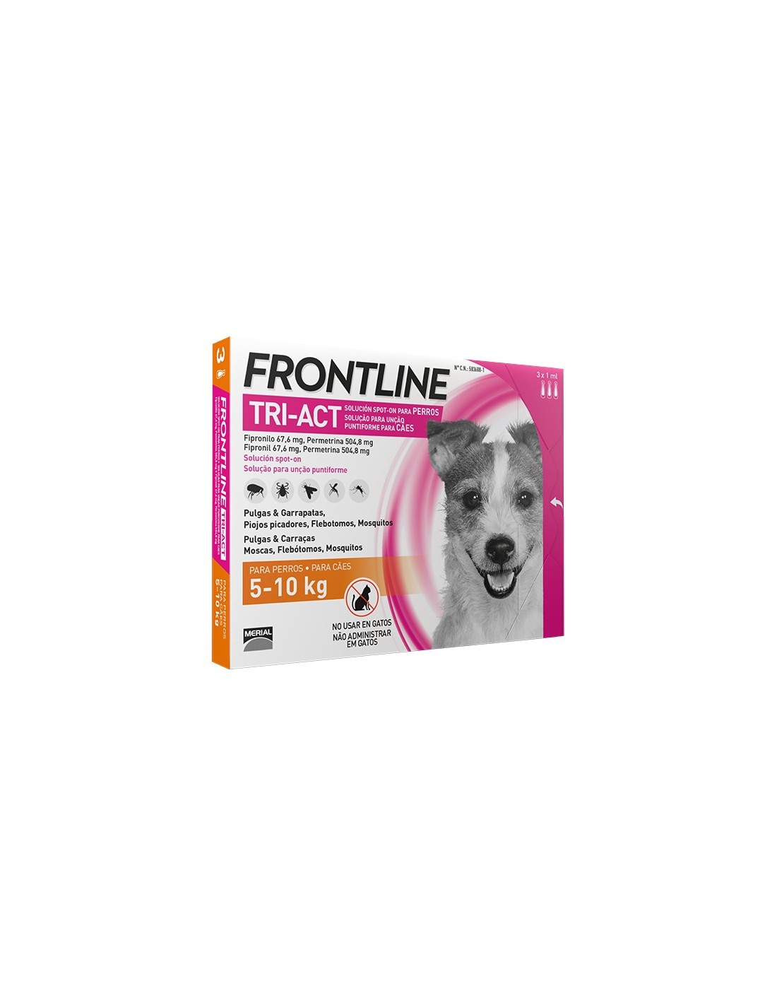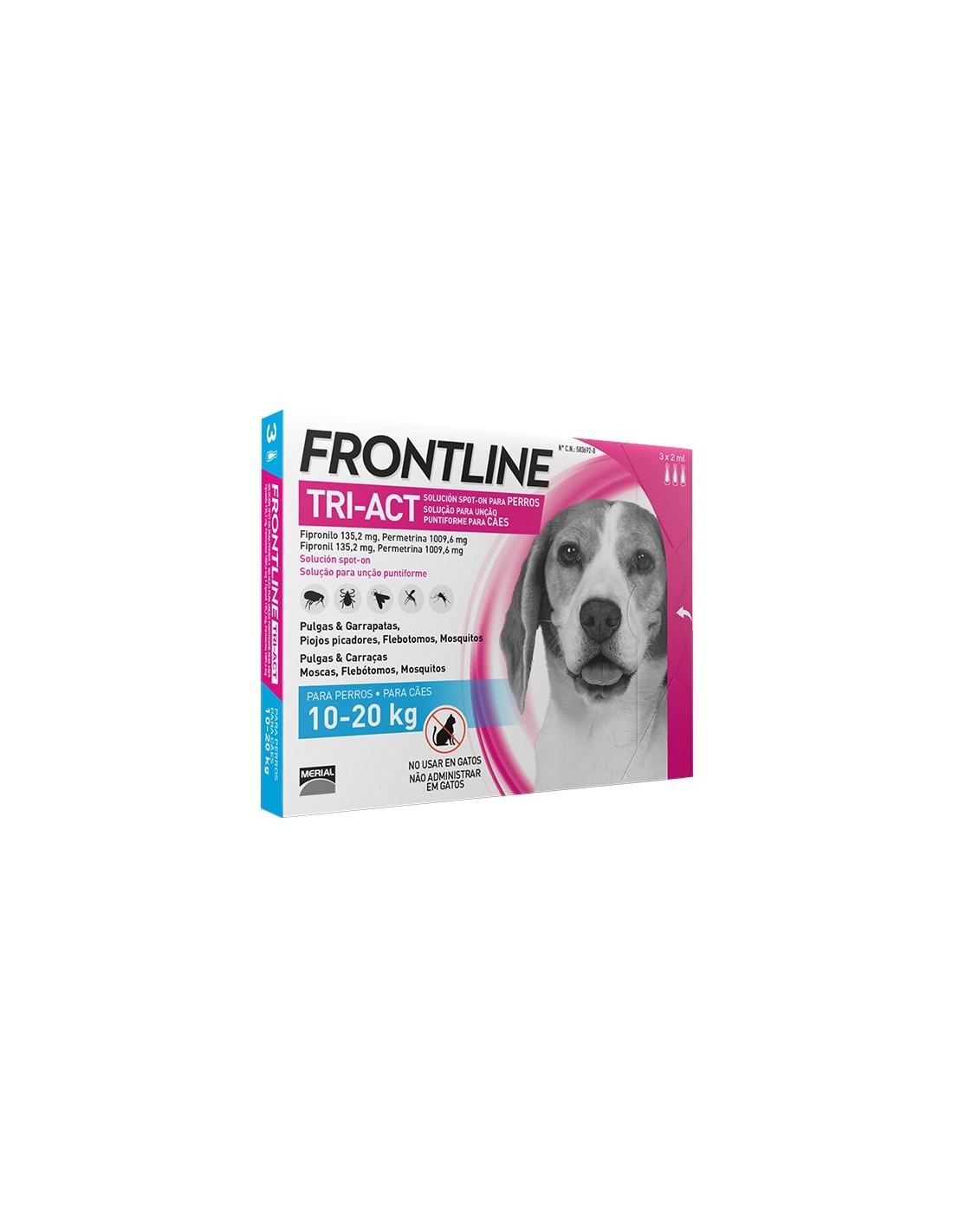 El uso mensual de FRONTLINE TRI-ACT le ayudará a proteger a su perro en áreas con un riesgo elevado de enfermedades transmitidas por flebotomos (leishmaniosis), mosquitos (filariosis), garrapatas (babesiosis, ehrlichiosis, anaplasmosis, enfermedad de Lyme) y pulgas (rickettsiosis, bartonelosis, dipilidiosis).