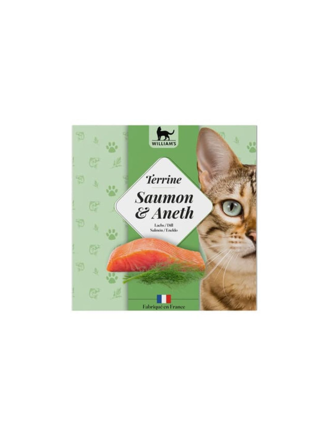 Deliciosa tarrina para gatos de salmón y eneldo sin cereales, con pescado fresco procedente directamente de la piscifactoría Beaufort de Isère.
