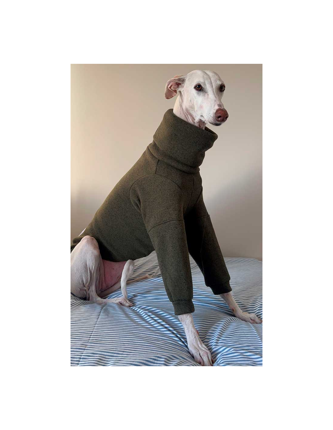 Elegante forro polar en color verde kaki. Aislará a tu perro del frío, diseñado especialmente para su peculiar disposición anatómica.