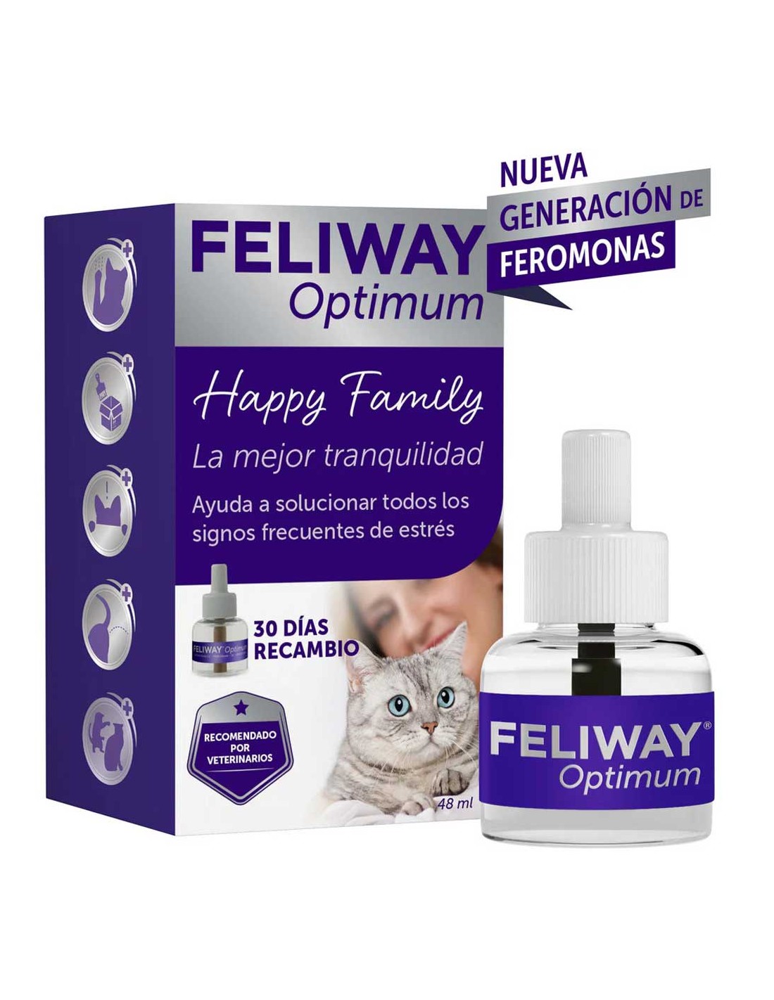 Nuestro estilo de vida moderno desorganiza la armonía territorial de los gatos pudiendo afectar a su bienestar y su salud. El nuevo FELIWAY Optimum lo equilibra, mejorando el bienestar de los gatos y mejorando el vínculo para conseguir hogares y familias más felices. Las investigaciones y los estudios realizados han demostrado que FELIWAY Optimum: